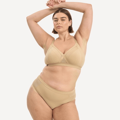The love-child of the high waist and the bikini, hello Midi Brief! It’s that perfect balance of not too high, not too low, just right. Designed with our signature soft Bio Butter and topped off with a Flossy Mesh panel detail, you’ve found your new staple in this brief. With a smooth elastic waist and a luxe organza leg trim, we only want the best for you in terms of comfort and off-the-charts chic-ness.